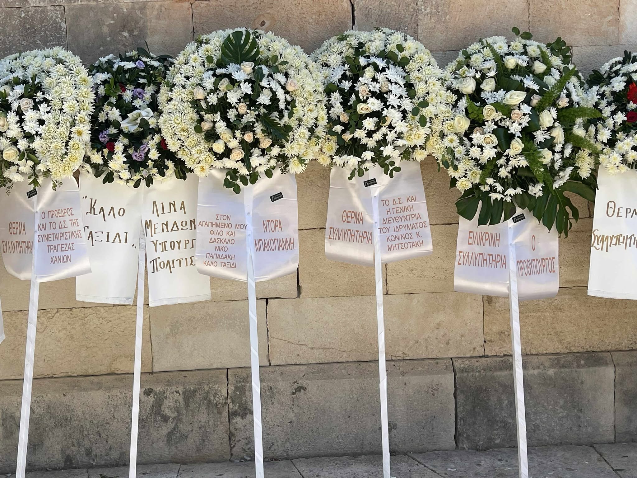 Μεταξύ των στεφάνων που απεστάλησαν, ξεχώρισαν αυτά του ΑΕ του Προέδρου της Ελληνικής Δημοκρατίας, Κωνσταντίνου Τασούλα, των προκατόχων του κ. Αικατερίνης Σακελλαρόπουλου και κ. Προκόπη Παυλόπουλου, του Πρωθυπουργού Κυριακου Μητσοτάκη, του Προέδρου της Βουλής, Νικήτα Κακλαμάνη και άλλων εκπροσώπων τοπικών και εθνικών θεσμικών φορέων και σωματείων. Η ταφή θα γίνει στον τόπο καταγωγής του εκλιπόντος, στον Βαμο Αποκορώνου.
