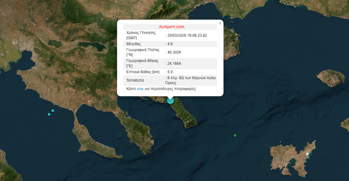 Ισχυρή σεισμική δόνηση 4,9 βαθμών της κλίμακας Ρίχτερ σημειώθηκε το βράδυ της Τετάρτης 25 Μαρτίου, 8 χιλιόμετρα ΒΔ των Καρυών Αγίου Όρους.