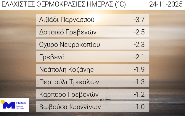 Συμφωνα με το meteo η χαμηλότερη ελάχιστη θερμοκρασία καταγράφεται στο Λιβάδι Παρνασσού με -3,7 °C. Σύμφωνα με το δίκτυο αυτόματων μετεωρολογικών σταθμών του Εθνικού Αστεροσκοπείου Αθηνών / meteo.gr οι οκτώ χαμηλότερες ελάχιστες θερμοκρασίες τις πρωινές ώρες της Δευτέρας 24/11, παρουσιάζονται στον παρακάτω πίνακα και σημειώθηκαν σε Γρεβενά, Νευροκόπι, Κοζάνη, Περτούλι, Ιωάννινα.