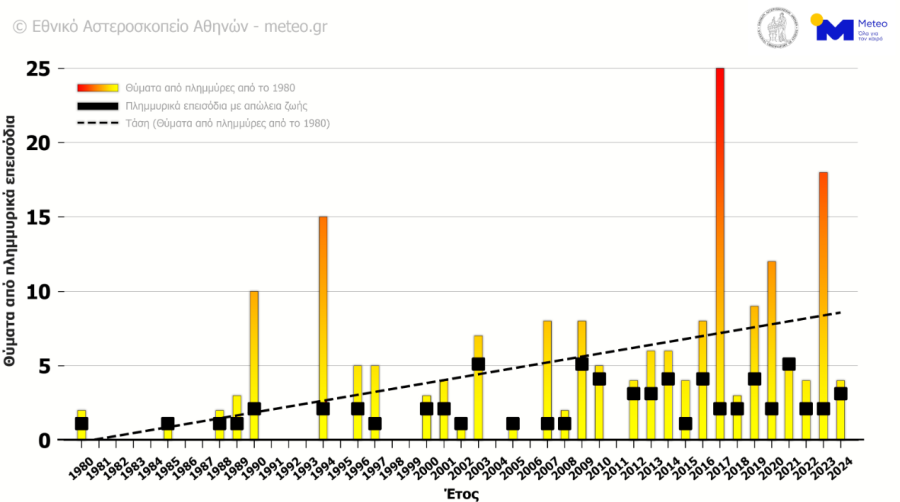 Η ανησυχητική τάση, όπως επισημαίνεται από το Meteo, είναι πως ο αριθμός των θανάτων από πλημμύρες αυξάνεται με την πάροδο του χρόνου. Ενδεικτικά, την τελευταία δεκαετία σημειώθηκαν οι μισοί από τους καταγεγραμμένους θανάτους στο σύνολο της περιόδου των 45 ετών.