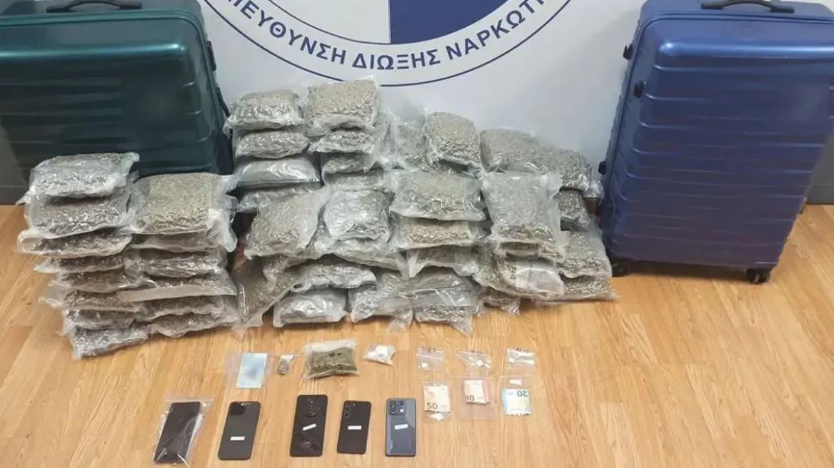 Ο 27χρονος αφίχθη από το εξωτερικό με δύο βαλίτσες που περιείχαν 32 κιλά ακατέργαστης κάνναβης (skunk), τα οποία θα παραλάμβανε ο 35χρονος για διακίνηση μέσω ταξί.