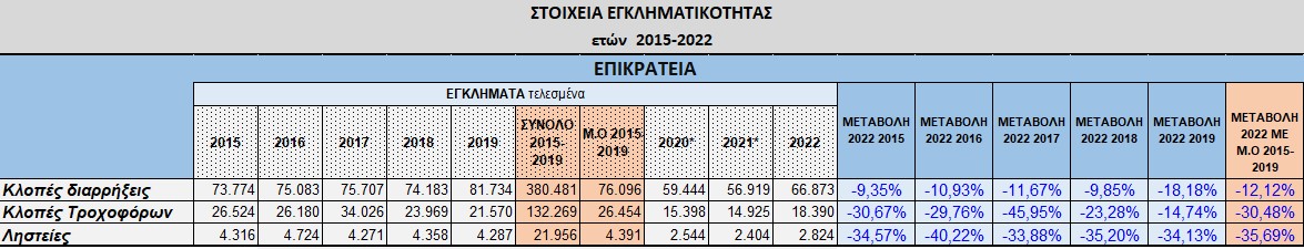 Κλοπές-Διαρρήξεις: Μείον 12,12% το 2022 σε σύγκριση με τον μέσο όρο της περιόδου 2015-2019.