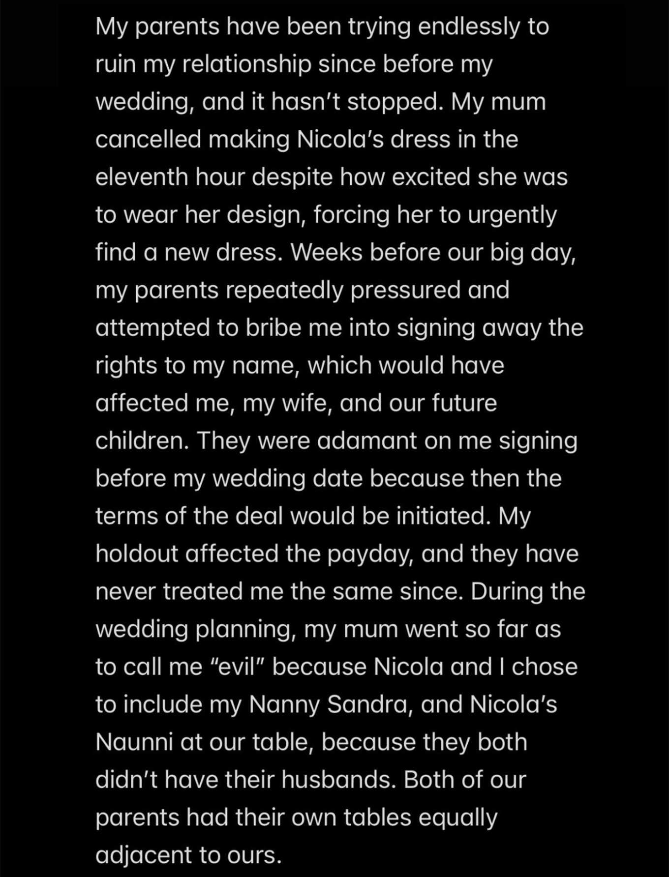 «Οι γονείς μου προσπαθούν αδιάκοπα να καταστρέψουν τη σχέση μου από πριν ακόμη από τον γάμο μου, και αυτό δεν έχει σταματήσει. Η μητέρα μου ακύρωσε την τελευταία στιγμή τη δημιουργία του νυφικού της Νίκολα, παρότι εκείνη ανυπομονούσε να φορέσει το σχέδιό της, αναγκάζοντάς την να βρει επειγόντως άλλο φόρεμα. Λίγες εβδομάδες πριν από τον γάμο μας, οι γονείς μου με πίεζαν επανειλημμένα και προσπάθησαν να με δωροδοκήσουν για να παραιτηθώ από τα δικαιώματα στο όνομά μου, κάτι που θα επηρέαζε εμένα, τη σύζυγό μου και τα μελλοντικά μας παιδιά. Ήταν ανένδοτοι στο να υπογράψω πριν από την ημερομηνία του γάμου, ώστε να τεθούν σε ισχύ οι όροι της συμφωνίας. Η άρνησή μου επηρέασε την πληρωμή και από τότε δεν μου φέρθηκαν ποτέ με τον ίδιο τρόπο», γράφει.