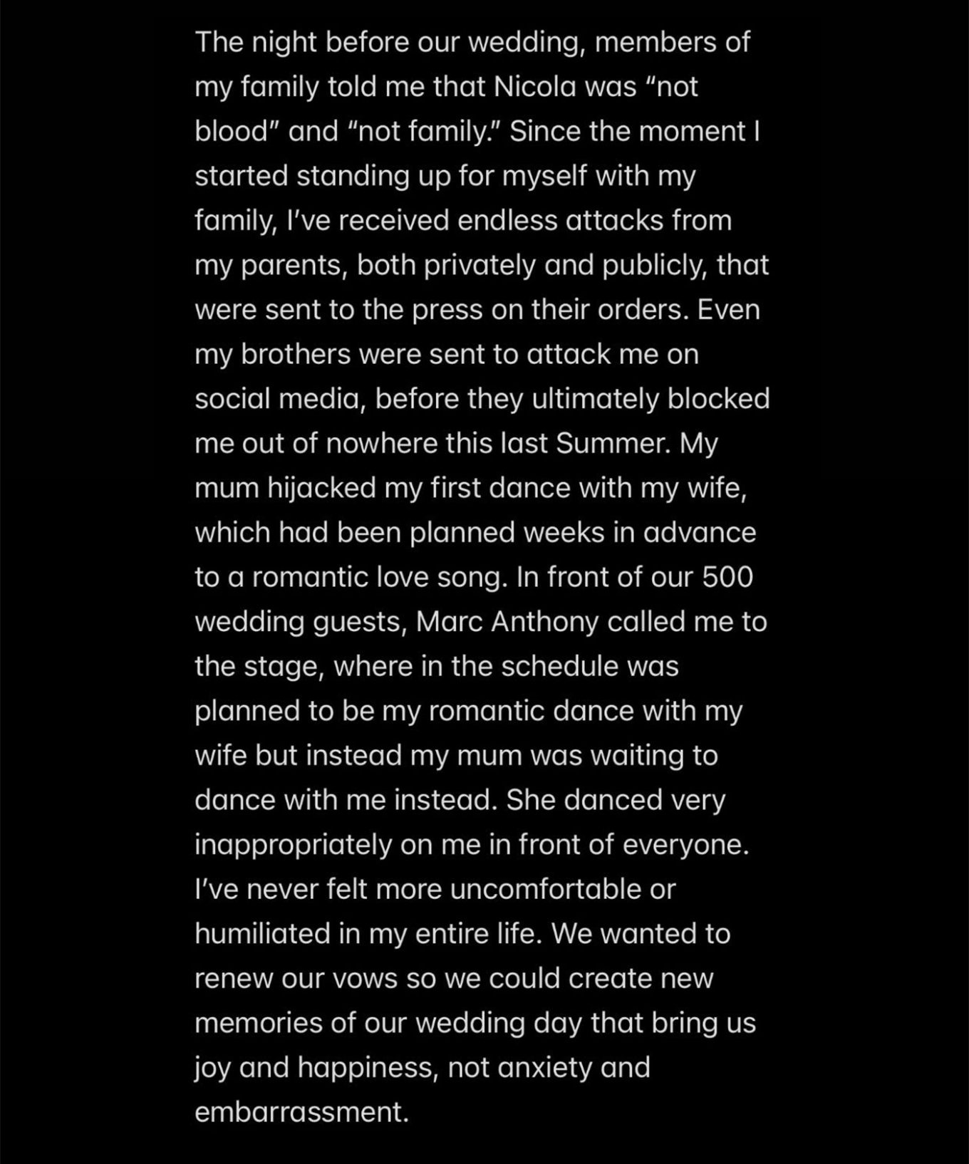 Στη συνέχεια, αφού πρόσθεσε: «Κατά τη διάρκεια της προετοιμασίας του γάμου, η μητέρα μου έφτασε στο σημείο να με αποκαλέσει “κακό” επειδή η Νίκολα κι εγώ επιλέξαμε να έχουμε στο τραπέζι μας τη γιαγιά μου, Σάντρα, και τη γιαγιά της Νίκολα, τη Ναούνι, καθώς και οι δύο δεν είχαν τους συζύγους τους. Και οι δύο γονείς μας είχαν τα δικά τους τραπέζια, εξίσου κοντά στο δικό μας. Το βράδυ πριν από τον γάμο, μέλη της οικογένειάς μου μου είπαν ότι η Νίκολα “δεν είναι αίμα” και “δεν είναι οικογένεια”», περιέγραψε τον τρόπο με τον οποίο η μητέρα του κατέστρεψε τον πρώτο του χορό με τη Νίκολα Πελτζ, ως νεόνυμφο ζευγάρι στη δεξίωση του γάμου τους:«Από τη στιγμή που άρχισα να υπερασπίζομαι τον εαυτό μου απέναντι στην οικογένειά μου, δέχομαι αδιάκοπες επιθέσεις από τους γονείς μου, τόσο ιδιωτικά όσο και δημόσια, οι οποίες διοχετεύονται στον Τύπο κατ’ εντολή τους. Ακόμη και τα αδέλφια μου στάλθηκαν να μου επιτεθούν στα social media, πριν τελικά με μπλοκάρουν απροσδόκητα το περασμένο καλοκαίρι. Η μητέρα μου καπέλωσε τον πρώτο μου χορό με τη σύζυγό μου, ο οποίος είχε προγραμματιστεί εδώ και εβδομάδες σε ένα ρομαντικό τραγούδι αγάπης».