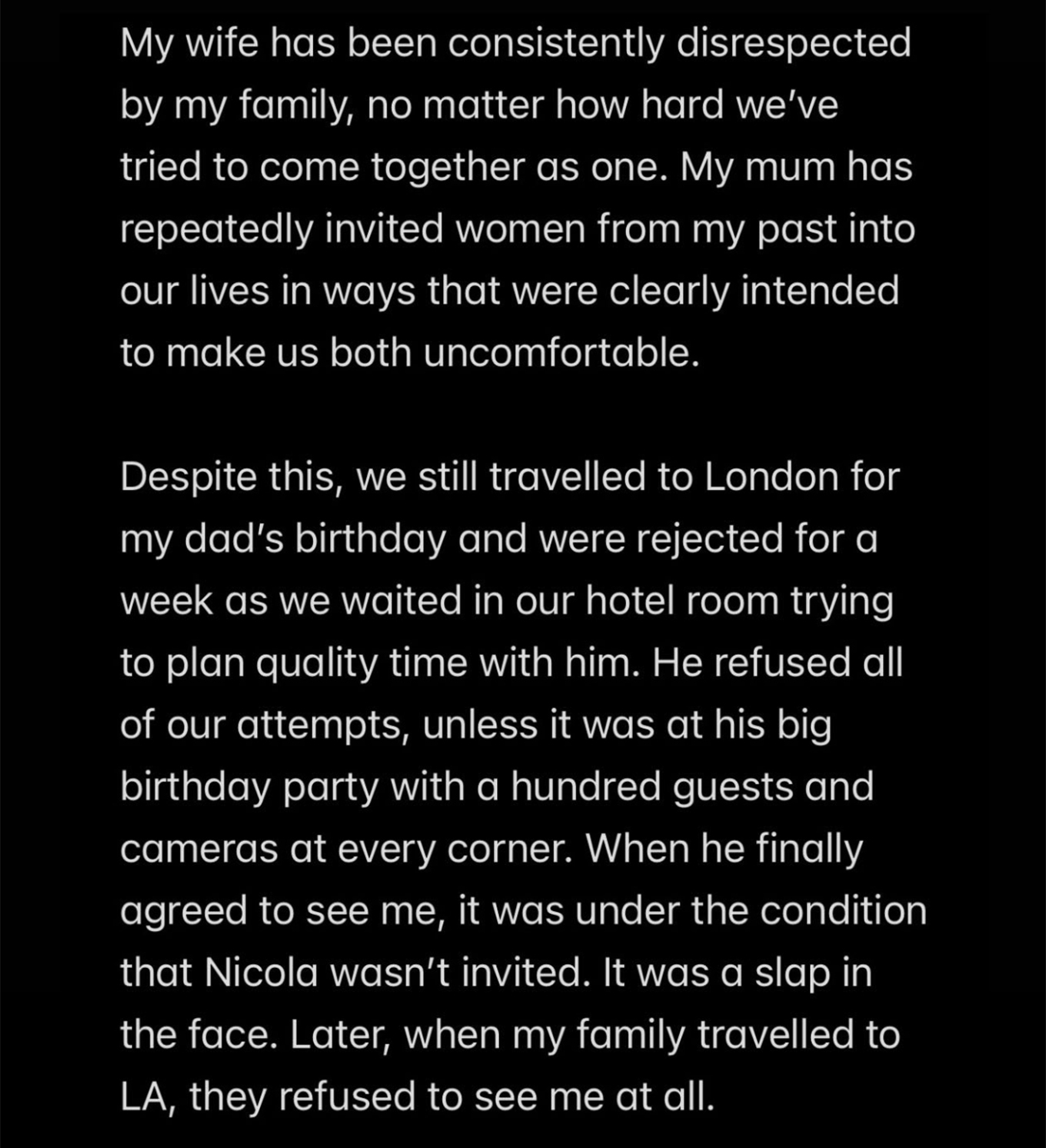 Αναφερόμενος στην απουσία του από το πάρτι του Ντέιβιντ Μπέκαμ για τα 50ά του γενέθλια, εξήγησε: «Παρόλα αυτά, ταξιδέψαμε στο Λονδίνο για τα γενέθλια του πατέρα μου και αγνοηθήκαμε για μία εβδομάδα, περιμένοντας στο ξενοδοχείο μας να κανονίσουμε χρόνο μαζί του. Αρνήθηκε κάθε μας προσπάθεια, εκτός αν γινόταν στο μεγάλο πάρτι γενεθλίων του, με εκατοντάδες καλεσμένους και κάμερες παντού. Όταν τελικά δέχτηκε να με δει, έθεσε ως όρο να μην προσκληθεί η Νίκολα. Ήταν χαστούκι στο πρόσωπο. Αργότερα, όταν η οικογένειά μου ταξίδεψε στο Λος Άντζελες, αρνήθηκαν να με δουν καθόλου».
