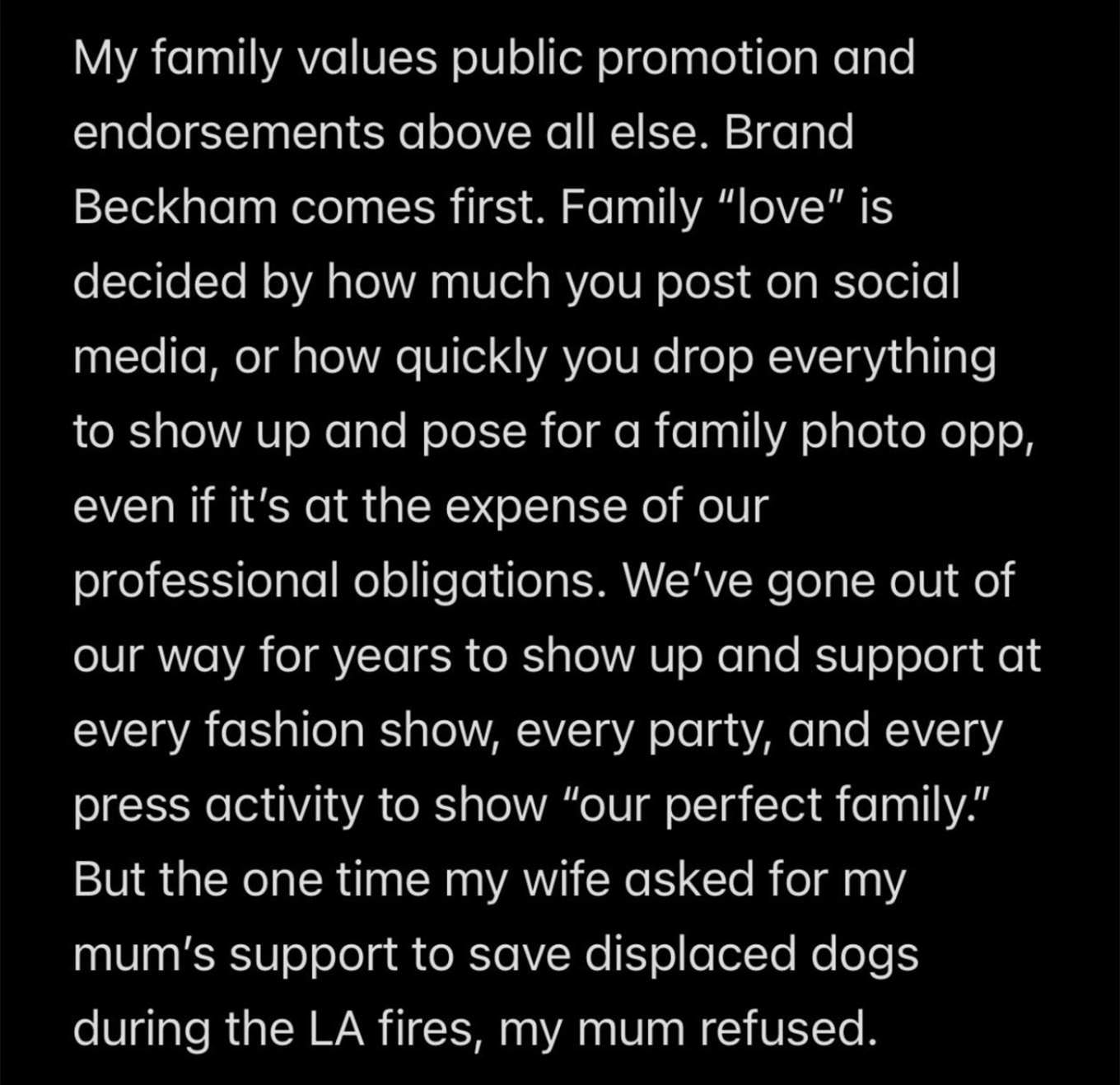 Ο Ντέιβιντ και η Βικτόρια Μπέκαμ βάζουν τη δημόσια εικόνα τους. «Η οικογένειά μου βάζει πάνω απ’ όλα τη δημόσια προβολή και τις συνεργασίες. Το brand Beckham έρχεται πρώτο. Η “αγάπη” της οικογένειας κρίνεται από το πόσο ανεβάζεις στα social media ή από το πόσο γρήγορα αφήνεις τα πάντα για να ποζάρεις σε μια οικογενειακή φωτογραφία, ακόμη κι αν αυτό γίνεται εις βάρος των επαγγελματικών μας υποχρεώσεων. Για χρόνια κάναμε τα πάντα για να είμαστε παρόντες και να στηρίζουμε κάθε επίδειξη μόδας, κάθε πάρτι και κάθε δραστηριότητα προβολής, για να δείχνουμε την “τέλεια οικογένειά” μας. Όμως τη μία φορά που η σύζυγός μου ζήτησε τη στήριξη της μητέρας μου για να σωθούν εκτοπισμένα σκυλιά κατά τις πυρκαγιές στο Λος Άντζελες, εκείνη αρνήθηκε. Η αφήγηση ότι η σύζυγός μου με ελέγχει είναι εντελώς αντεστραμμένη. Για το μεγαλύτερο μέρος της ζωής μου ήμουν εγώ αυτός που ελεγχόταν από τους γονείς του».