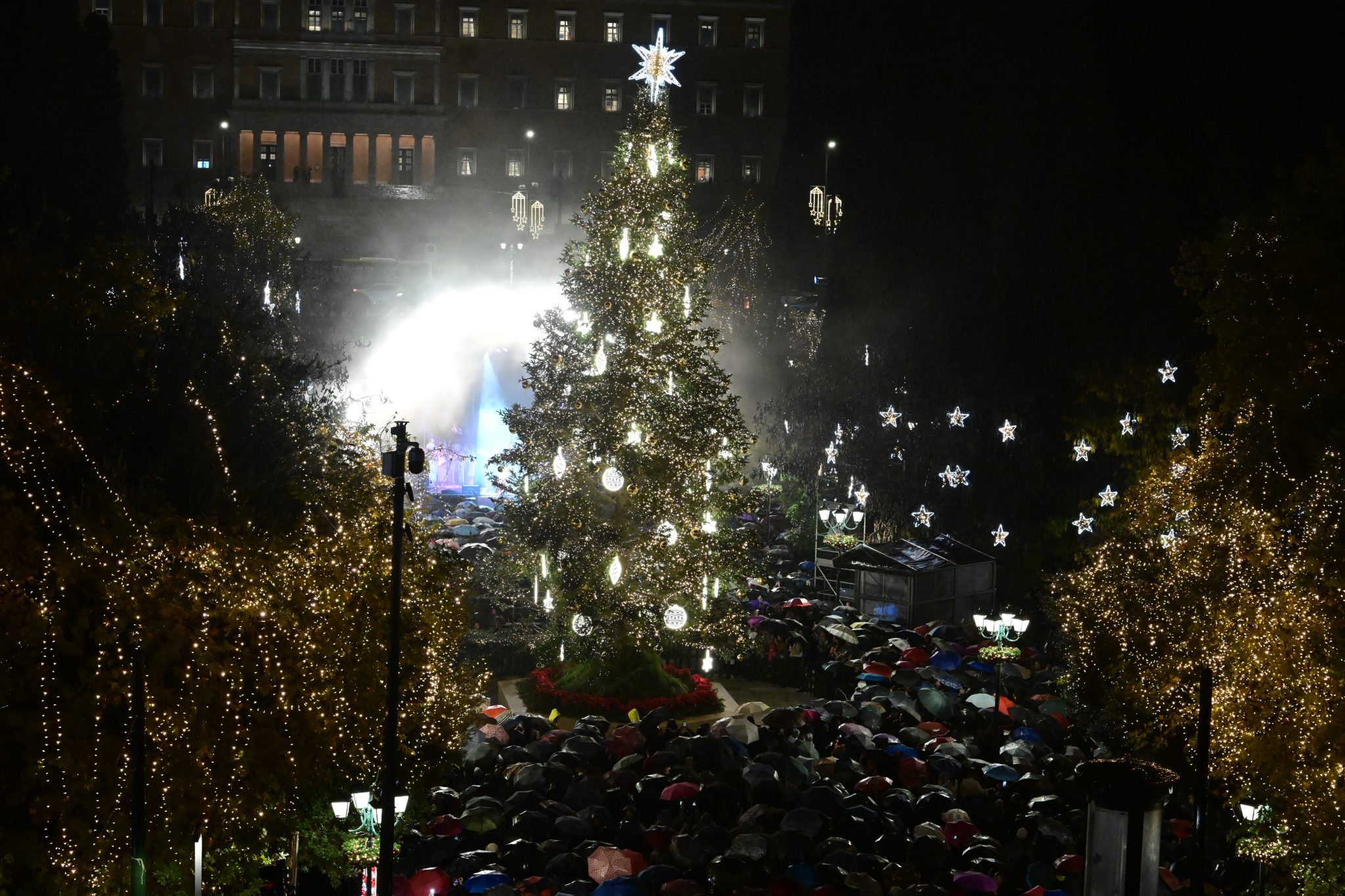 Υπό βροχή και με συνοδεία μουσικής φωταγωγήθηκε το χριστουγεννιάτικο δέντρο της Αθήνας