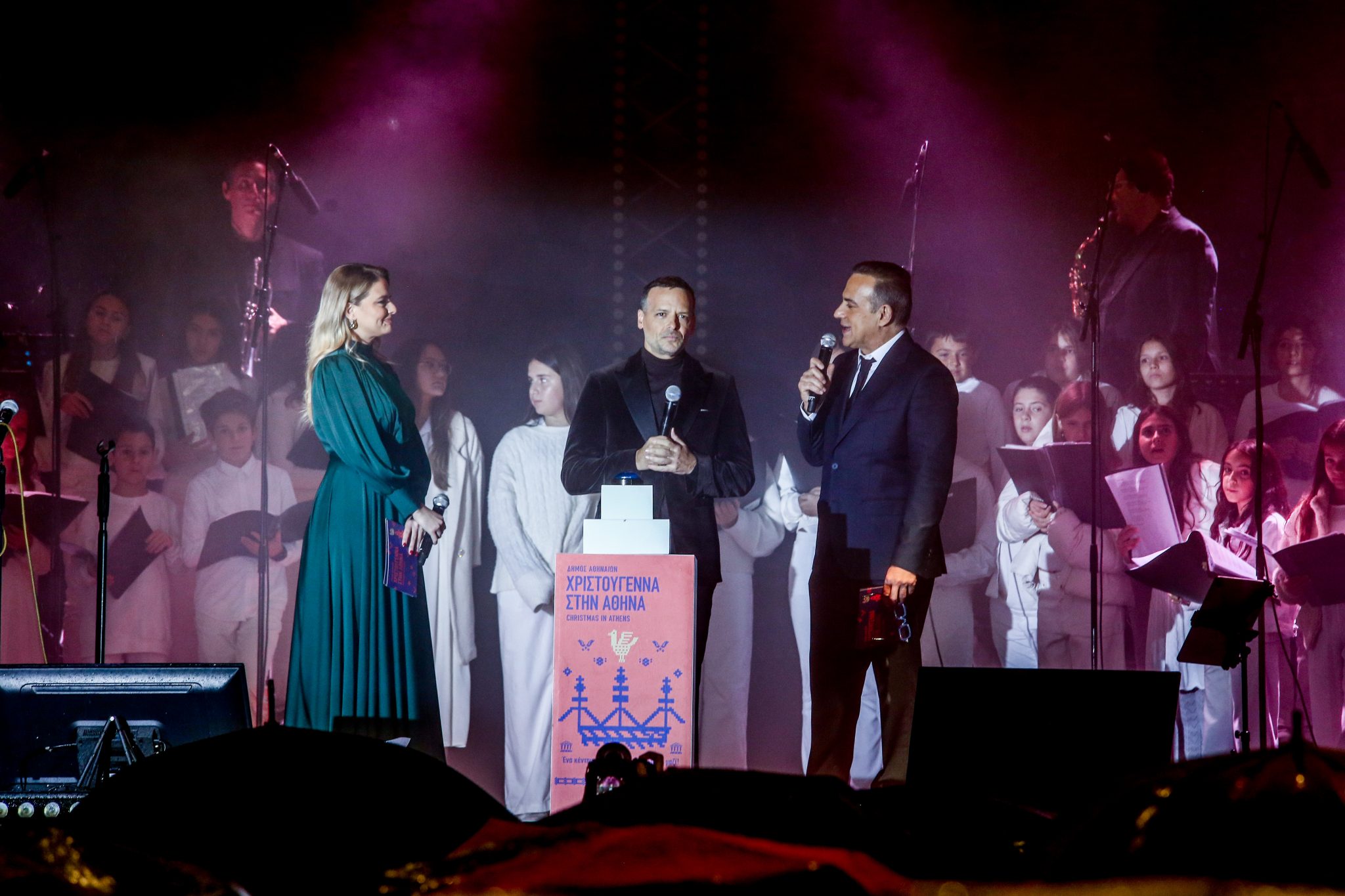 Η εορταστική εκδήλωση ξεκίνησε το απόγευμα με χριστουγεννιάτικες μελωδίες από την Big Band του δήμου Αθηναίων και στη συνέχεια από τη Φιλαρμονική Ορχήστρα.