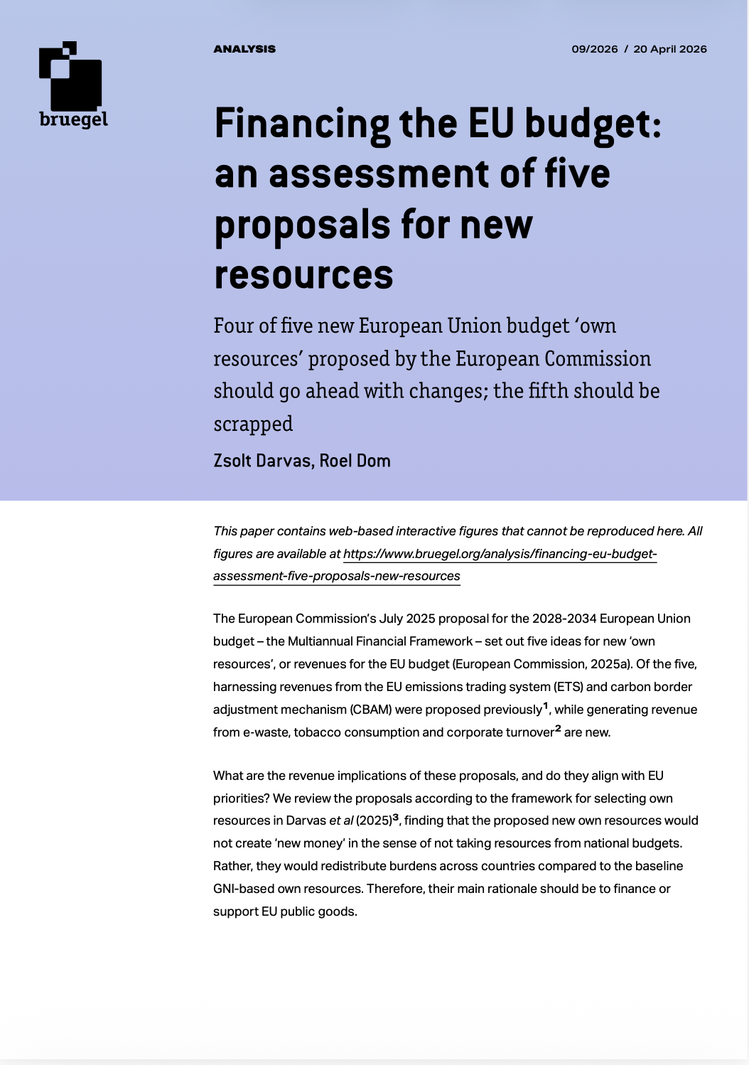 Λίγες ημέρες πριν από την άτυπη Σύνοδο Κορυφής της Κύπρου, στις 23-24 Απριλίου, όπου οι ηγέτες της ΕΕ θα συζητήσουν για το νέο Πολυετές Δημοσιονομικό Πλαίσιο (ΠΔΠ) 2028-2034, το Ινστιτούτο Bruegel δημοσίευσε εκτενή ανάλυση για τους πέντε νέους «ιδίους πόρους» που πρότεινε η Ευρωπαϊκή Επιτροπή τον Ιούλιο του 2025. Το συμπέρασμα είναι τόσο τεχνικό όσο και πολιτικά εκρηκτικό: η ΕΕ χρειάζεται χρήματα, και κάποιος θα τα πληρώσει.