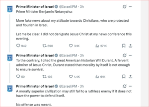 Στην ανάρτηση που ακολούθησε, ο Νετανιάχου έκανε λόγο για «fake news όσον αφορά τη στάση μου απέναντι στου Χριστιανούς που είναι προστατευμένοι και ζουν καλά στο Ισραήλ. Το ξεκαθαρίζω: Δεν υποτίμησα τον Ιησού Χριστό. Αντίθετα επικαλέστηκα τον μεγάλο ιστορικό Γουίλ Ντουράντ έναν ένθερμος θαυμαστή του Ιησού Χριστού, ο οποίος υποστήριξε ότι η ηθική από μόνη της δεν αρκεί για να διασφαλίσει την επιβίωση. Ένας ηθικά ανώτερος πολιτισμός μπορεί παρ’ όλα αυτά να καταρρεύσει απέναντι σε έναν αδίστακτο εχθρό, αν δεν έχει τη δύναμη να υπερασπιστεί τον εαυτό του».