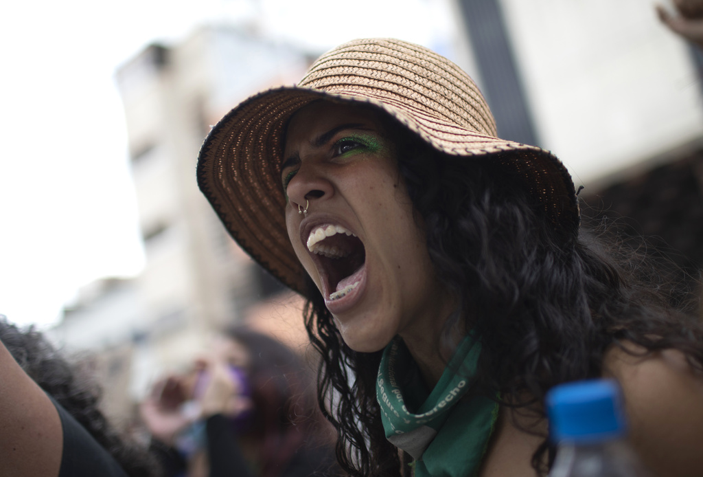 Γυναίκα από τη φεμινιστική ομάδα «Tinta Violeta» φωνάζει συνθήματα απαιτώντας δικαιοσύνη για τις γυναίκες που έχουν πέσει θύματα βίας κατά τη διάρκεια διαμαρτυρίας για την Παγκόσμια Ημέρα της Γυναίκας στο Καράκας της Βενεζουέλας. (AP Photo/Ariana Cubillos)