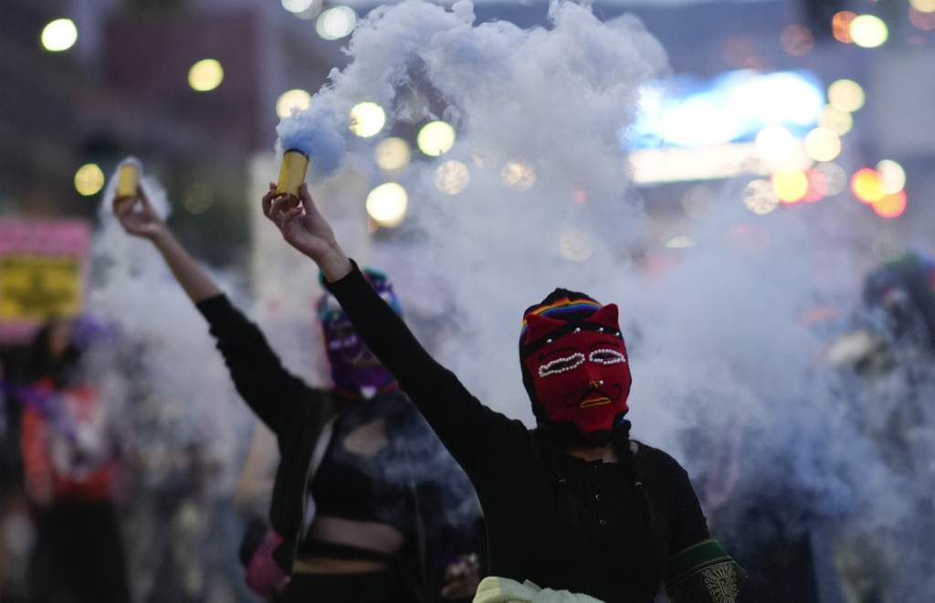 Διαδηλωτές φωνάζουν συνθήματα κατά τη διάρκεια συλλαλητηρίου για την Παγκόσμια Ημέρα της Γυναίκας, στην Αθήνα. (AP Photo/Yorgos Karahalis)