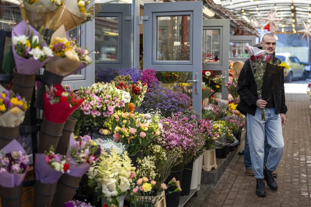 Ένας άνδρας κρατάει μπουκέτο λουλουδιών για την Παγκόσμια Ημέρα της Γυναίκας στο Βίλνιους της Λιθουανίας. (AP Photo/Mindaugas Kulbis)