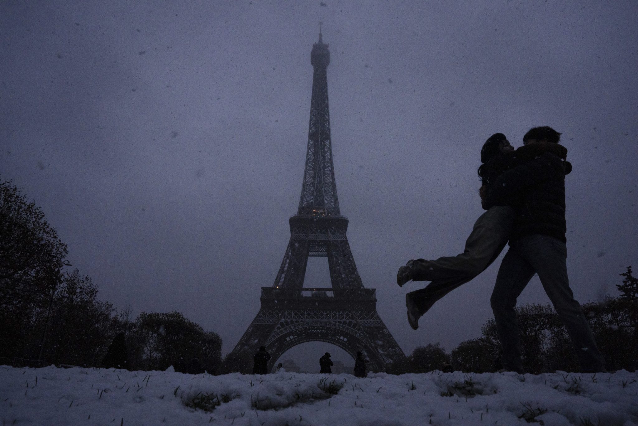 χιονισμένου Παρισιού, με μερικούς να εκμεταλλεύονται την ευκαιρία για να κάνουν σκι στις πλαγιές της Μονμάρτρης και κατά μήκος των κήπων στο Πεδίον του Άρεως κάτω από τον Πύργο του Άιφελ.