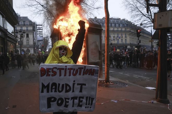 Σύμφωνα με τους Financial Times, οι διαμαρτυρίες κατά των αντιδημοφιλών συνταξιοδοτικών σχεδίων του Μακρόν έχουν πάρει μια πιο απρόβλεπτη τροπή από τότε που η κυβέρνηση παρέκαμψε μια κοινοβουλευτική ψηφοφορία στα μέσα Μαρτίου για να περάσει τον νόμο, οδηγώντας σε αντιδράσεις που μετατρέπονται σε πολιτικό πονοκέφαλο για την κυβέρνηση. Αφού περισσότεροι από 1 εκατ. άνθρωποι συμμετείχαν σε πορείες σε όλη τη Γαλλία την περασμένη Πέμπτη, στο περιθώριο ξέσπασαν συγκρούσεις με την αστυνομία. Οι διαδηλωτές έβαλαν φωτιά σε κάδους σκουπιδιών στο κέντρο του Παρισιού, με αποτέλεσμα η αστυνομία να ρίξει δακρυγόνα.