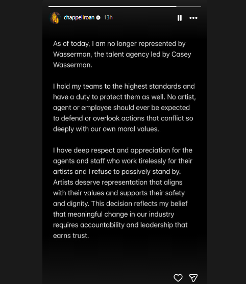Η τραγουδίστρια Chappell Roan ανακοίνωσε ότι αποχωρεί από την εταιρεία ταλέντων Wasserman, που διευθύνεται από τον Casey Wasserman, του οποίου το όνομα εμφανίζεται στα αρχεία Epstein.