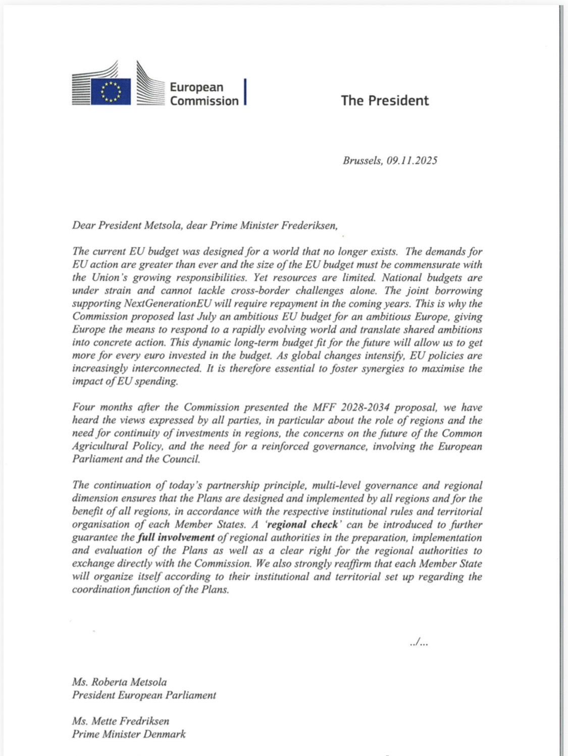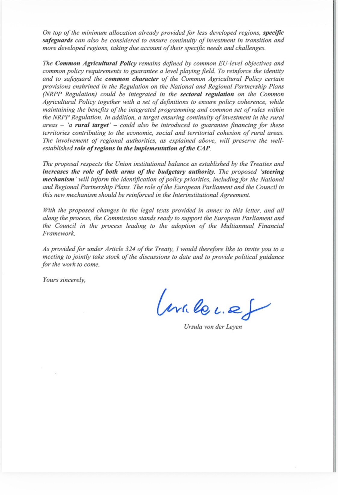 Η επιστολή καταλήγει με πρόσκληση για συνάντηση των θεσμικών οργάνων, προκειμένου να επιτευχθεί μια πολιτική συμφωνία για το νέο χρηματοδοτικό πλαίσιο, διατηρώντας ταυτόχρονα την ισορροπία μεταξύ των ευρωπαϊκών θεσμών που ορίζουν οι Συνθήκες.