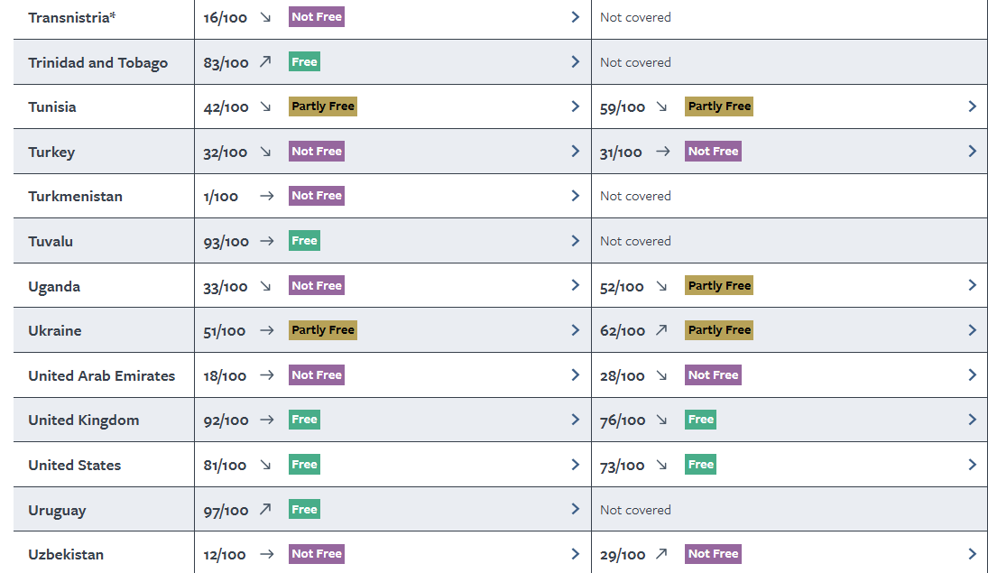 Η μόνη χώρα που πήρε τον τέλειο βαθμό 100 για την ελευθερία είναι η Φινλανδία. Στην άλλη άκρη βρίσκεται μόνο το Νότιο Σουδάν, που πήρε βαθμό 0.