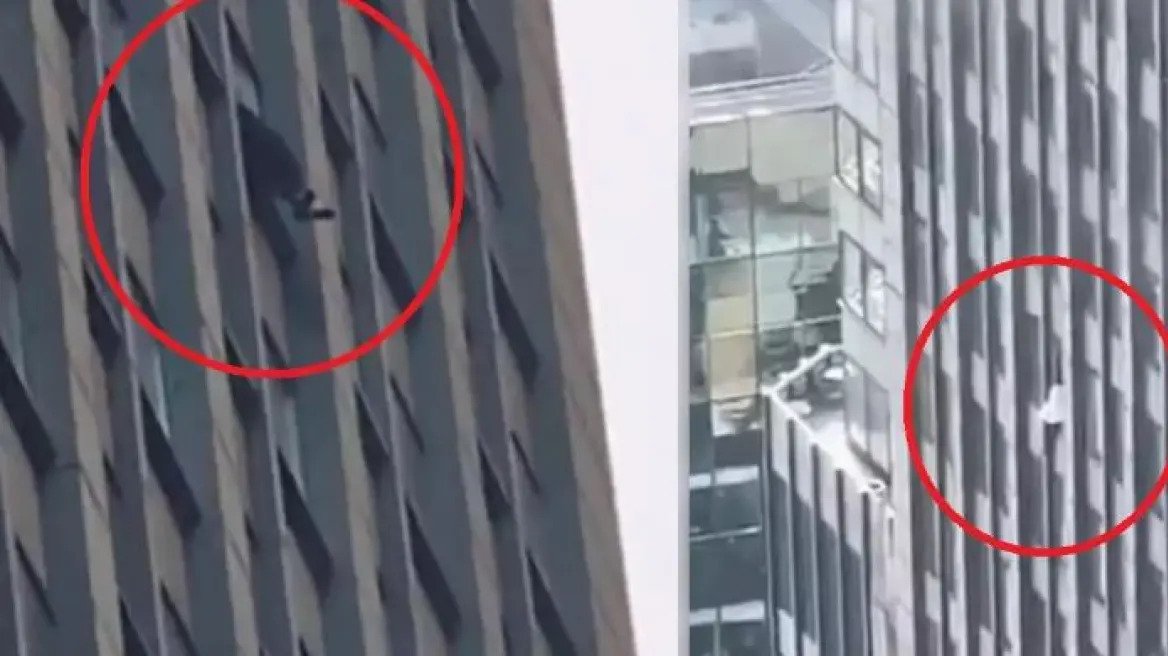 Σύμφωνα με την DailyMail, πρόκειται για έναν μαύρο άνδρα ενώ στα πλάνα που κυκλοφορούν στα social media διακρίνονται τα πόδια του να κρέμονται στο κενό, αφού ο ίδιος κάθεται στο περβάζι του παραθύρου, σε ύψος εκατοντάδων μέτρων.