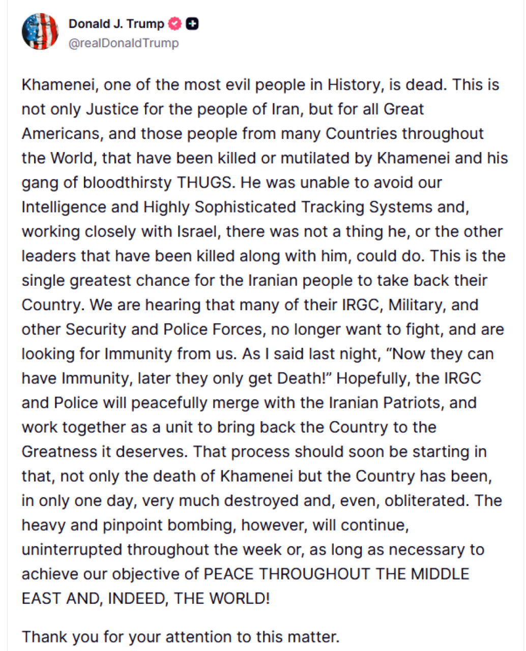 «Ο Χαμενεΐ, ένας από τους πιο διαβολικούς ανθρώπους στην ιστορία, είναι νεκρός. Αυτό δεν είναι μόνο δικαιοσύνη για τον λαό του Ιράν, αλλά και για όλους τους μεγάλους Αμερικανούς και τους ανθρώπους από πολλές χώρες σε όλο τον κόσμο, που έχουν σκοτωθεί ή ακρωτηριαστεί από τον Χαμενεΐ και τη συμμορία του αιμοδιψών ΤΡΑΜΠΟΥΚΩΝ.