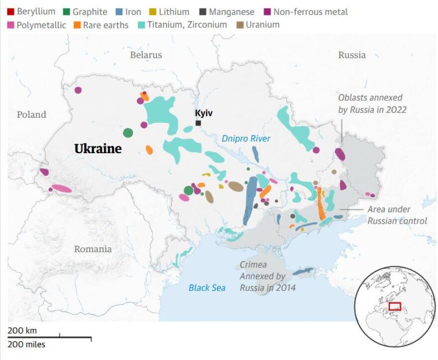 Η βρετανική εφημερίδα αποτύπωσε σε γράφημα τις περιοχές που βρίσκονται ο ορυκτός πλούτος και οι σπάνιες γαίες που διεκδικεί ο Τραμπ για λογαριασμό των ΗΠΑ.