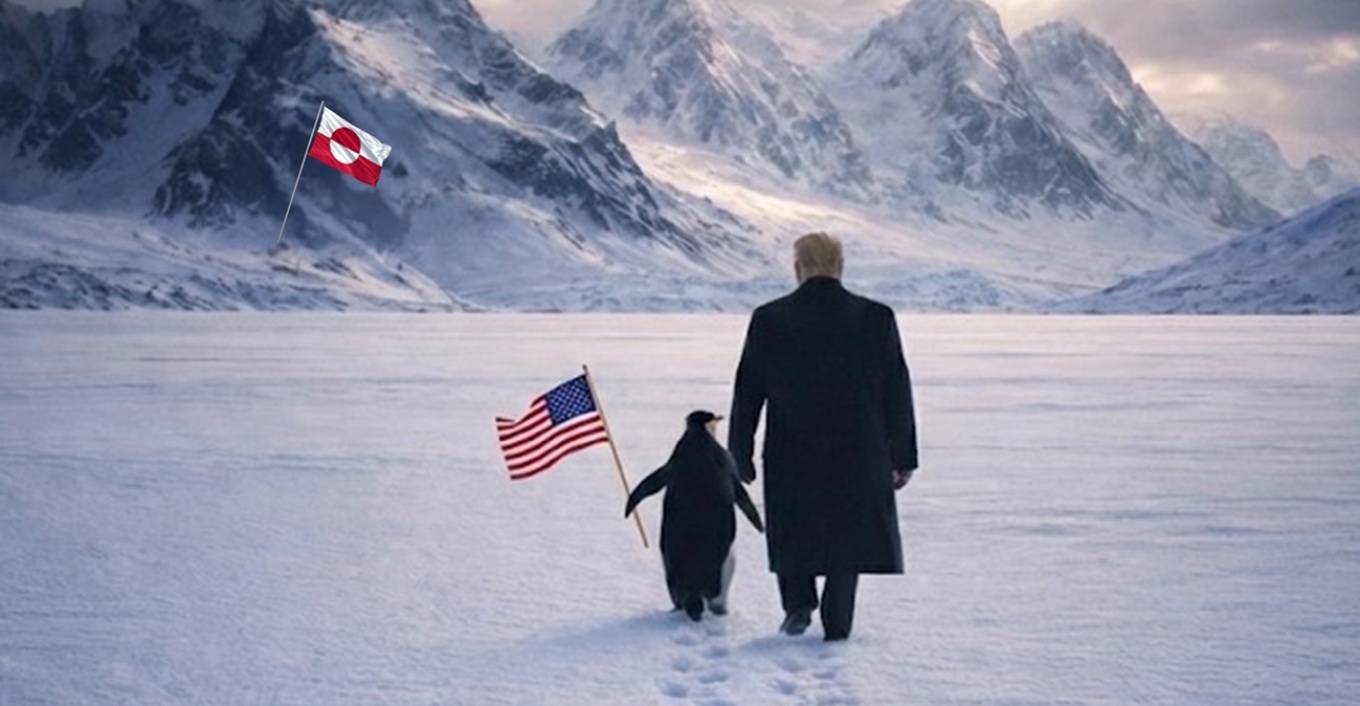 Την Παρασκευή το βράδυ, μια ανάρτηση που προκάλεσε πληθώρα αντιδράσεων εμφανίστηκε στον λογαριασμό του Λευκού Οίκου στο X, παρουσιάζοντας τον Αμερικανό πρόεδρο να βαδίζει προς μια οροσειρά γεμάτη πάγους στη Γροιλανδία, κρατώντας μαζί του έναν πιγκουίνο που φέρει τη σημαία των Ηνωμένων Πολιτειών.