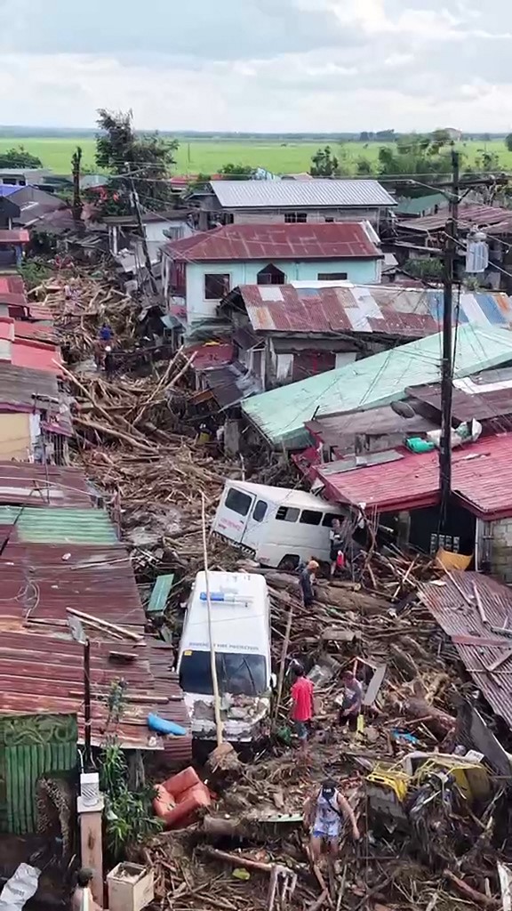 Πλάνα από drone έδειξαν καταστροφικές πλημμύρες που μετέτρεψαν δρόμους σε ποτάμια, βύθισαν σπίτια και ανέτρεψαν αυτοκίνητα, καθώς ο τυφώνας Καλμάγκι, γνωστός τοπικά ως Tino, έριξε σε ορισμένες περιοχές βροχή όση έφτανε σε πάνω από ένα μήνα σε μόλις 24 ώρες.