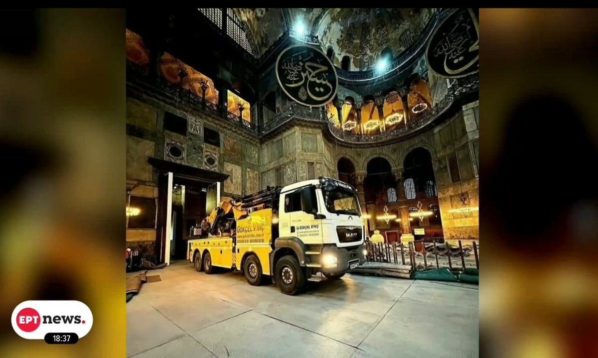 Νέες αντιδράσεις προκαλεί ο τρόπος που οι Τούρκοι αντιμετωπίζουν την Αγιά Σοφιά, μνημείο παγκόσμιας κληρονομιάς. Αυτή τη φορά, φωτογραφία που κάνει τον γύρο του διαδικτύου δείχνει μέσα στον Ναό γερανοφόρο φορτηγό, και σε μικρή απόσταση και δεύτερο βαρύ όχημα. Το Τουρκικό υπουργείο Πολιτισμού, πάντως, υποστηρίζει πως έχουν ληφθεί όλα τα απαραίτητα μέτρα με σεβασμό στο μνημείο.