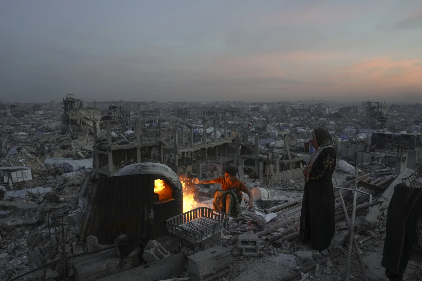Ο Παλαιστίνιος Αλί Μαρούφ και η μητέρα του, Αΐσα, μαγειρεύουν στην οροφή του σπιτιού τους, το οποίο καταστράφηκε από ισραηλινή επίθεση, στη Τζαμπαλιά, στη Λωρίδα της Γάζας, στις 17 Μαρτίου 2025.