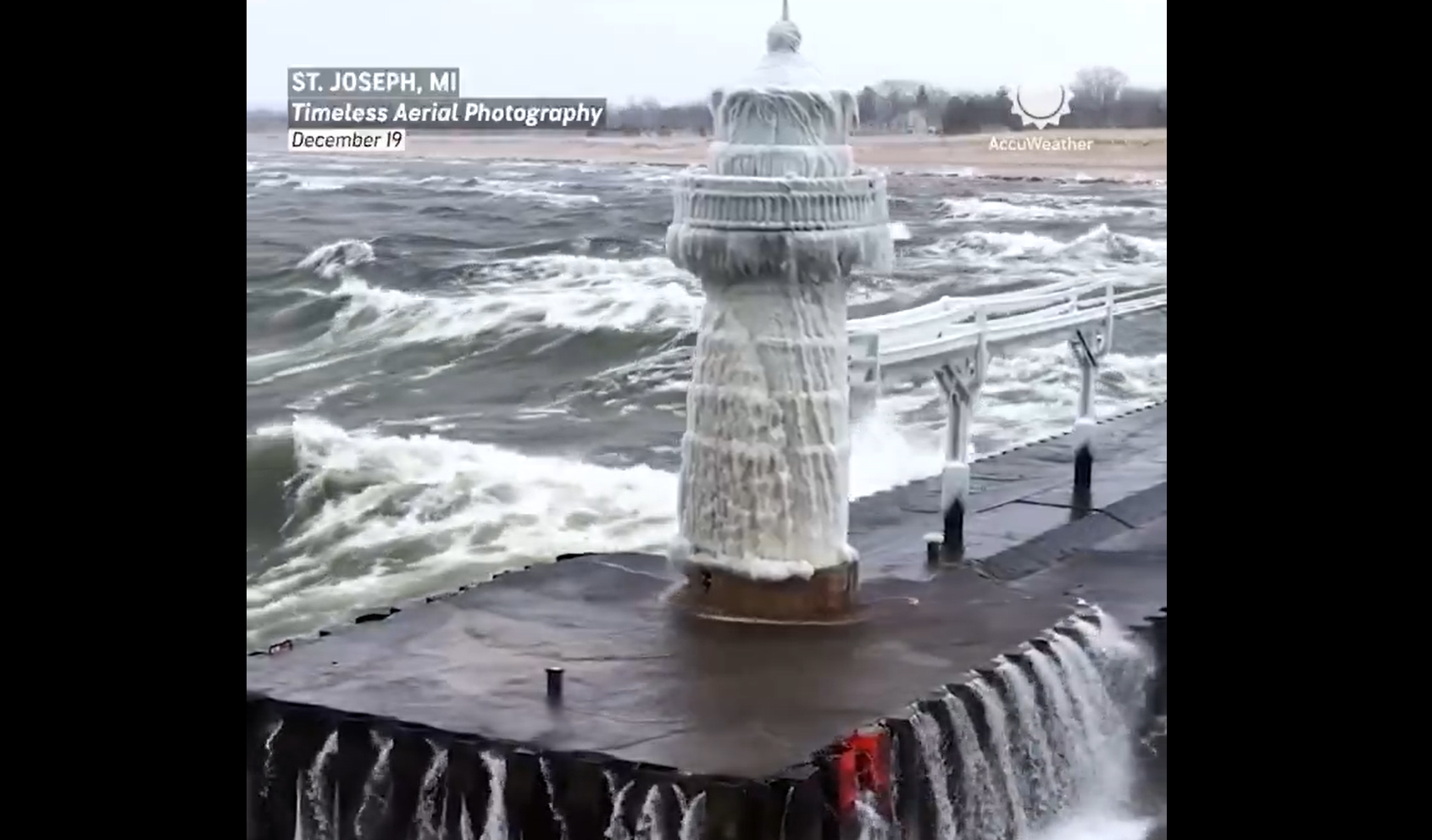 Βίντεο που ανάρτησαν μετεωρολογικές υπηρεσίες δείχνουν την αποβάθρα στη λίμνη Μίσιγκαν να έχει καλυφθεί από ένα συνεχές «τείχος» πάγου, καθώς το νερό από τα κύματα που χτυπούν την προβλήτα παγώνει αμέσως στα κάγκελα, δημιουργώντας παχιές στρώσεις και μεγάλους σταλακτίτες. Παρότι η ίδια η λίμνη δεν έχει ακόμη παγώσει πλήρως σε αυτή τη φάση της σεζόν, η παρατεταμένη ψυχρή εισβολή με μέγιστες θερμοκρασίες γύρω στους -3 έως -5°C και ελάχιστες σε τιμές «teens» σε °F (κάτω από -10°C) έχει μεταμορφώσει την ακτογραμμή σε χειμερινό «γλυπτό».