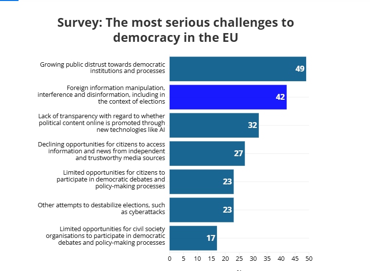 Σύμφωνα με πρόσφατη έρευνα του Ευρωβαρόμετρου, η «χειραγώγηση της πληροφόρησης από το εξωτερικό, οι παρεμβάσεις και η παραπληροφόρηση, μεταξύ άλλων, στο πλαίσιο των εκλογών», αποτελούν τη δεύτερη σοβαρότερη πρόκληση που αντιμετωπίζει η ΕΕ. Περισσότεροι από δύο στους πέντε Ευρωπαίους (42%) συμμερίζονται αυτή την άποψη. Σε ορισμένες χώρες, το ποσοστό αυτό ξεπερνά το 50%. Στην Ελλάδα το ποσοστό είναι 38%.