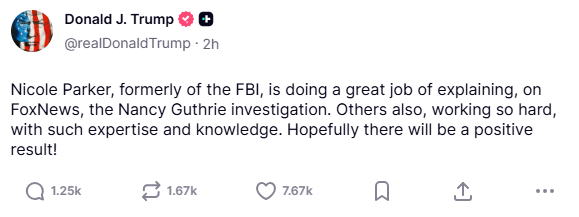 Η Νάνσι Γκάθρι, 84 ετών, απήχθη τη νύχτα της 31ης Ιανουαρίου προς την 1η Φεβρουαρίου από την κατοικία της στο Τουσόν της Αριζόνα. Η μυστηριώδης εξαφάνισή της έχει έκτοτε προσελκύσει το έντονο ενδιαφέρον των αμερικανικών μίντια, ενώ ο ίδιος ο πρόεδρος των ΗΠΑ δήλωσε σήμερα μέσω του Truth Social ότι παρακολουθεί τις εξελίξεις, ελπίζοντας σε μια «θετική κατάληξη».