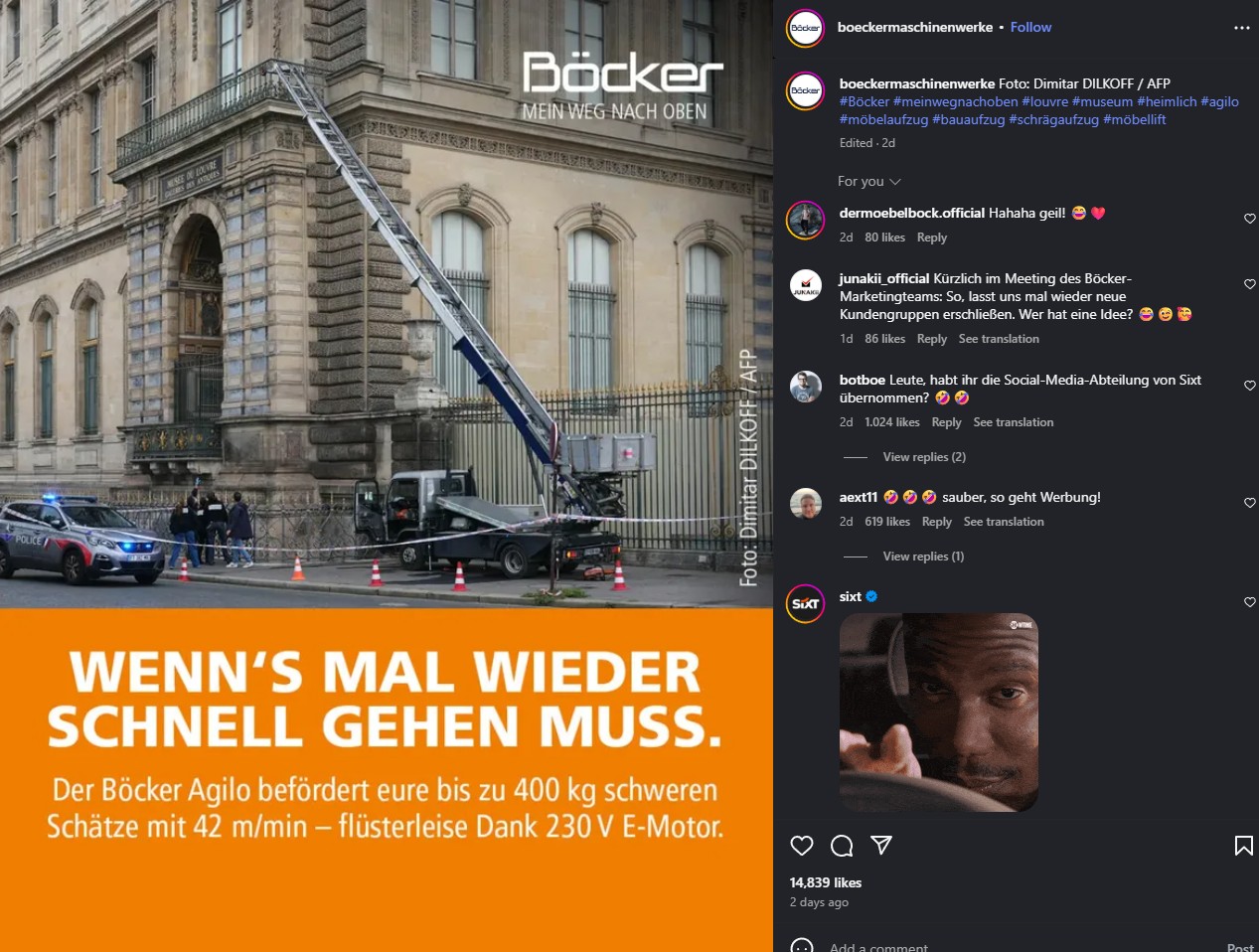 Η ληστεία κοσμημάτων στο Μουσείο του Λούβρου μπορεί να εξελίσσεται σε αστυνομικό θρίλερ, ωστόσο για μια γερμανική εταιρεία έγινε – έστω για λίγο – διαφημιστική ευκαιρία. Η Böcker Maschinenwerke, κατασκευάστρια του ανυψωτικού που χρησιμοποίησαν οι δράστες, ανάρτησε στα social media φωτογραφία του παρατημένου γερανού της μπροστά στο μουσείο, συνοδεύοντάς τη με το σλόγκαν: