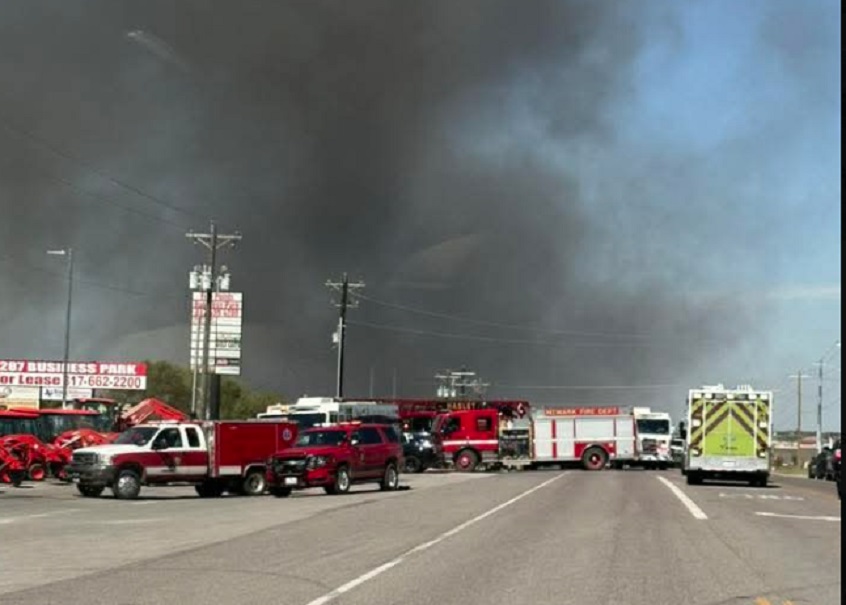 The incident involves multiple tractor-trailers engulfed in flames, producing heavy black smoke. pic.twitter.com/6bayrfWvaa