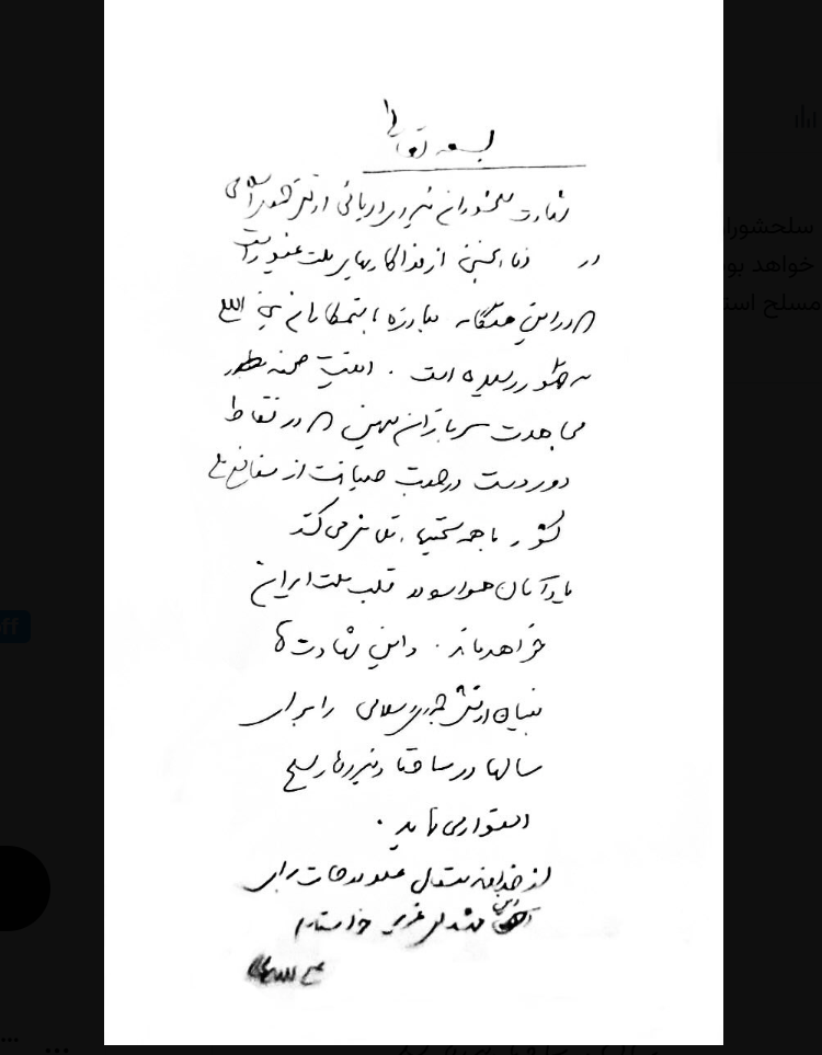 Χειρόγραφο σημείωμα του επικεφαλής της Εθνικής Ασφάλειας του Ιράν, Aλί Λαριτζανί, ο οποίος σύμφωνα με όλες τις πληροφορίες σκοτώθηκε στην Τεχεράνη αναρτήθηκε το πρωί της Τρίτης στον επίσημο λογαριασμό του στην ψηφιακή πλατφόρμα Χ.