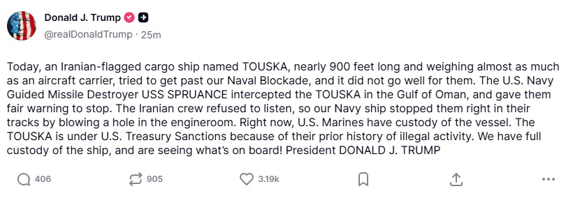 «Σήμερα, ένα φορτηγό πλοίο υπό ιρανική σημαία με το όνομα TOUSKA, μήκους σχεδόν 274 μέτρων και βάρους σχεδόν όσο ένα αεροπλανοφόρο, προσπάθησε να παραβιάσει τον ναυτικό μας αποκλεισμό, αλλά τα πράγματα δεν εξελίχθηκαν καλά για αυτούς», έγραψε στο Truth Social, ο Ντόναλντ Τραμπ.