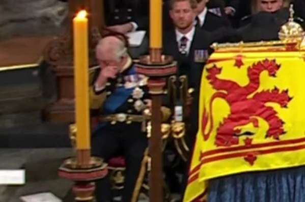 Στις φωτογραφίες που κάνουν το γύρο του διαδικτύου ο βασιλιάς Κάρολος και η πριγκίπισσα Άννα είναι φανερά καταβεβλημένοι αφού σήμερα αποχαιρετούν τη μητέρα τους, τη βασίλισσα Ελισάβετ. Ο Κάρολος φαινόταν συντετριμμένος και εξαντλημένος την ώρα που το φέρετρο μεταφερόταν μέσα στο Αββαείο για να ξεκινήσει η νεκρώσιμη ακολουθία. Μέσα στο Αββαείο ο φακός απαθανάτισε τον νέο βασιλιά να δακρύζει μπροστά από το φέρετρο της μητέρας του. Η παρακάτω φωτογραφία είναι από την εφημερίδα «The Sun» και είναι η μόνη που κυκλοφόρησε με τον βασιλιά να κλαίει.