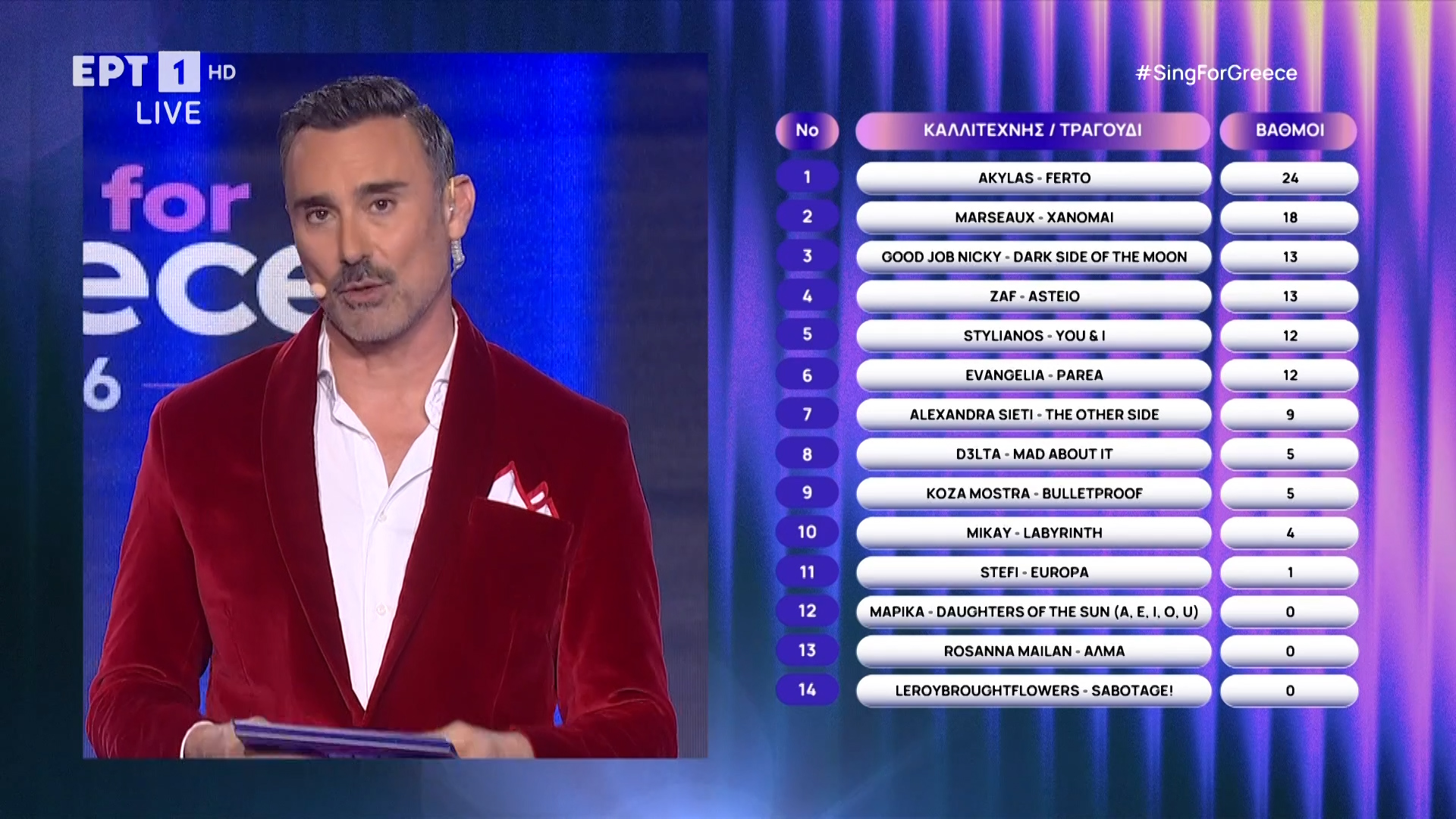 21:27 Σε αγγλική και γαλλική μετάφραση αντίστοιχα, η Κατερίνα Βρανά και ο Γιώργος Καπουτζίδης εξηγούν τη διαδικασία της βαθμολογίας για τους τηλεθεατές εκτός συνόρων, ενώ η κάρτα με τους 14 συμμετέχοντες και τους αριθμούς ψηφοφορίας δίνει τις απαραίτητες πληροφορίες.