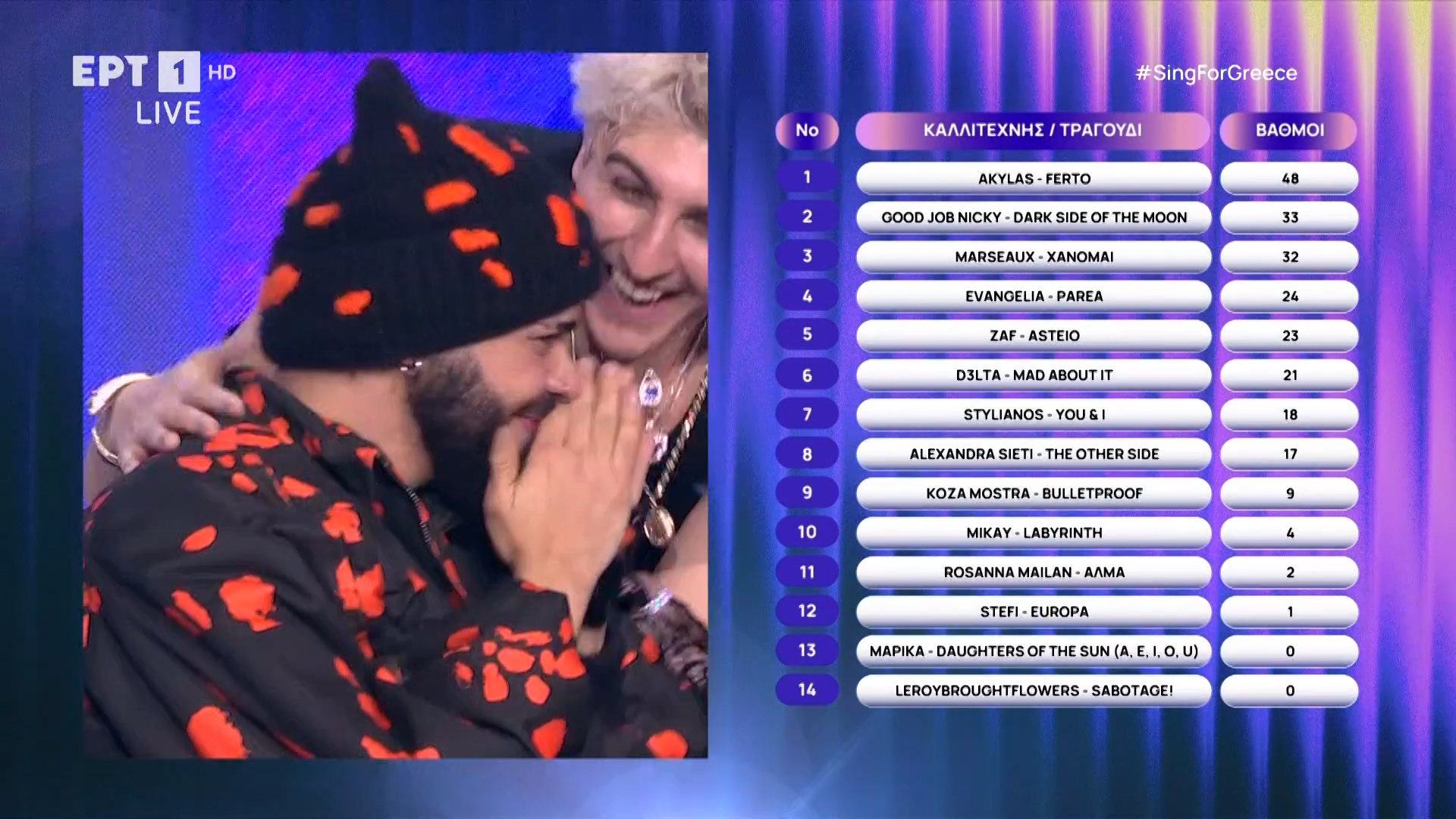 23:57 Μετά την ανακοίνωση των αποτελεσμάτων των δύο κριτικών επιτροπών, η κατάταξη διαμορφώνεται ως εξής:
