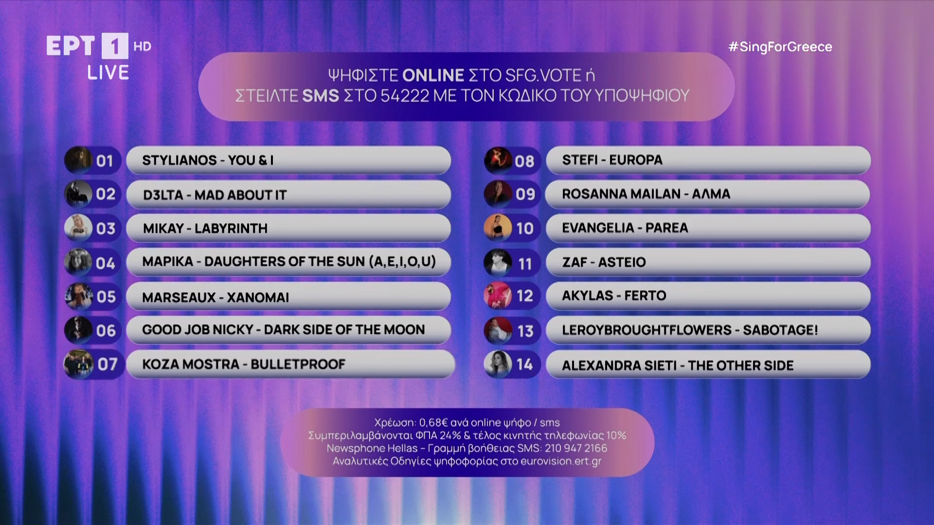 Ένα θα είναι το τραγούδι που θα πετάξει στην Αυστρία με τα ελληνικά χρώματα, διεκδικώντας αρχικά την πρόκριση από τον Α’ Ημιτελικό στις 12 Μαΐου και έπειτα την υψηλότερη δυνατή θέση για τη χώρα μας στον Μεγάλο Τελικό του Σαββάτου 16 Μαΐου.