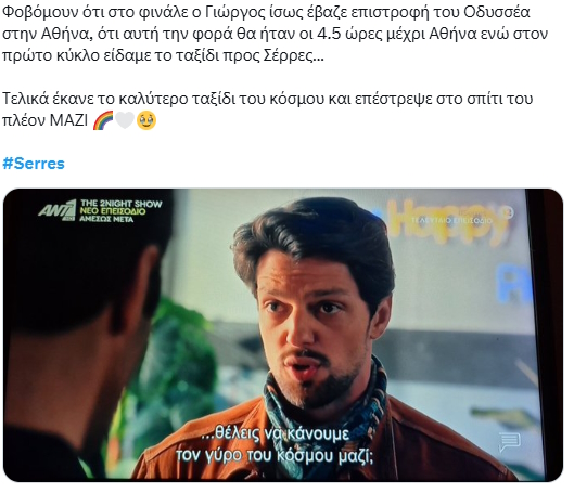 Οι «Σέρρες» του Γιώργου Καπουτζίδη, σε σκηνοθεσία Σταμάτη Πατρώνη, έριξαν αυλαία με ένα απρόσμενα συγκινητικό και ταυτόχρονα ευτυχισμένο τέλος. Ο Άγγελος (Αλέξανδρος Πιεχόβιακ), πριν φύγει για τον γύρο του κόσμου, προσκάλεσε τον Οδυσσέα να κάνουν μαζί αυτό το πολύπαθο ταξίδι προς την ευτυχία.