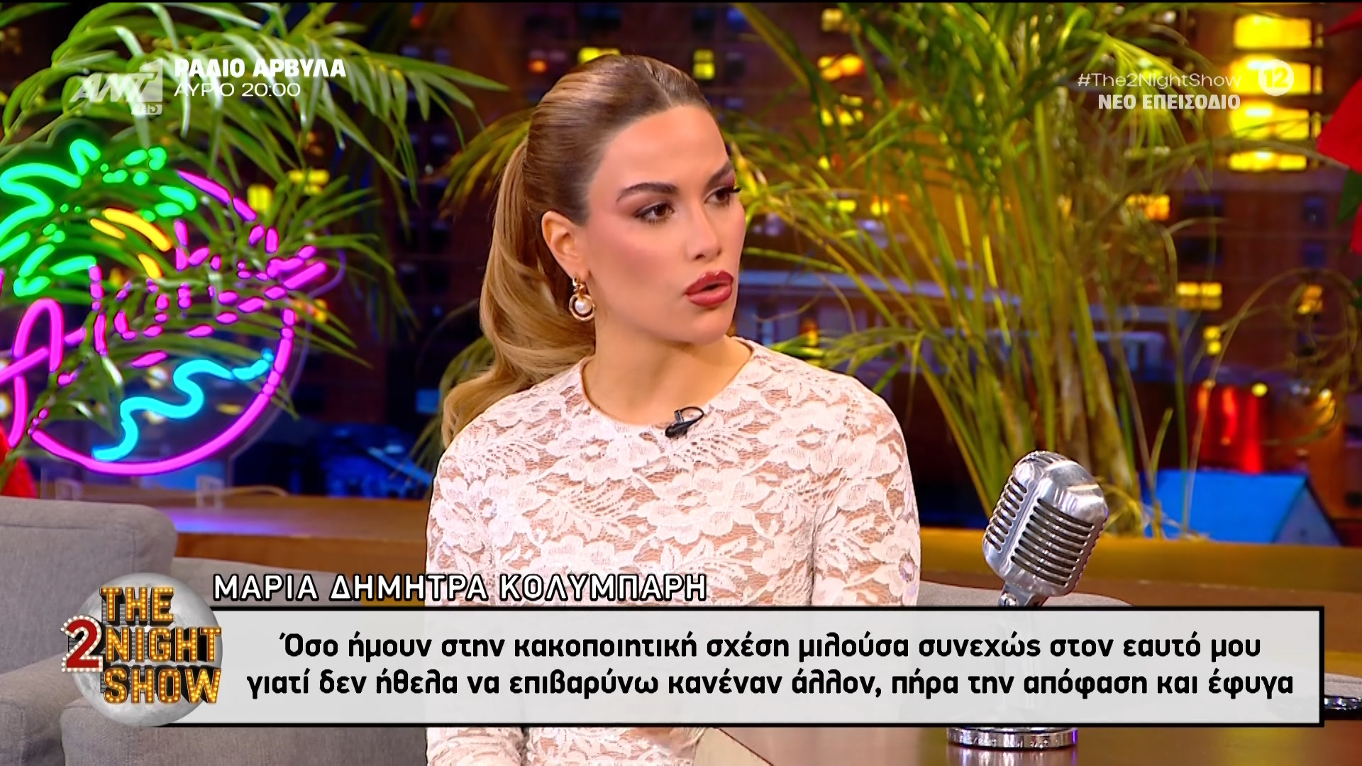 Η Μαρία Δήμητρα Κολυμπάρη βρέθηκε στο The 2Night Show με τον Γρηγόρη Αρναούτογλου και μίλησε για τη χειριστική σχέση που βίωσε. Η γνωστή χορεύτρια περιέγραψε πώς ο φόβος, η απομόνωση και η σύγχυση τη κράτησαν εγκλωβισμένη, αλλά και πώς βρήκε τελικά τη δύναμη να φύγει, θέλοντας το μήνυμά της να φτάσει σε άλλες γυναίκες.