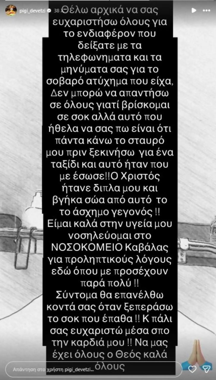 Η Πηγή Δεβετζή, με ένα στόρι της στο Instagram, επικοινώνησε με τους διαδικτυακούς της φίλους, και μίλησε για την κατάσταση της υγείας της ενώ όπως τόνισε προσπαθεί να ξεπεράσει το σοκ, ευχαρίστησε τον κόσμο που έδειξε ενδιαφέρον και τόνισε ότι «Ο Χριστός ήταν δίπλα μου και βγήκα σώα από αυτό το άσχημο γεγονός!!».