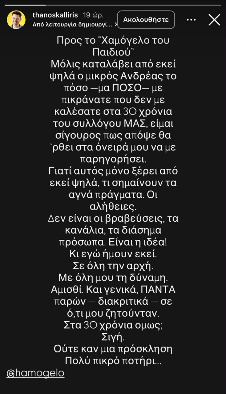 Το παράπονό του εξέφρασε ο Θάνος Καλλίρης μέσα από τον προσωπικό του λογαριασμό στο Instagram απέναντι στη διοίκηση του οργανισμού “Το Χαμόγελο του Παιδιού”.