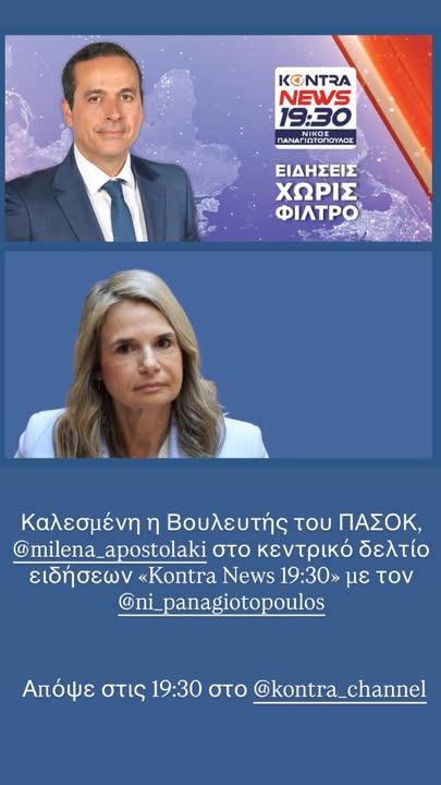 Καλεσμένη η Βουλευτής του ΠΑΣΟΚ, Μιλένα Αποστολάκη, στο Κεντρικό Δελτίο Ειδήσεων του Kontra με τον Νίκο Παναγιωτόπουλο