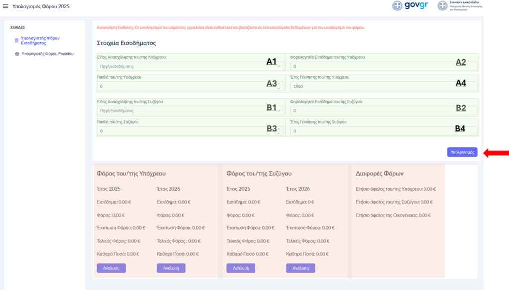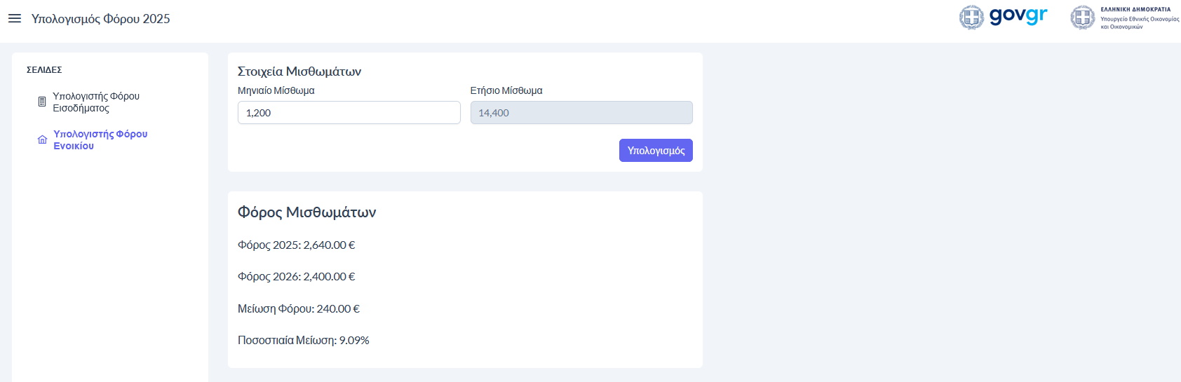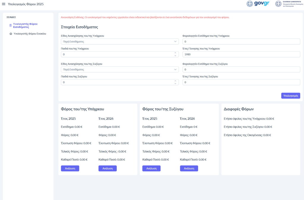 Η πλατφόρμα περιλαμβάνει δύο βασικά εργαλεία: τον Υπολογιστή Φόρου Εισοδήματος και τον Υπολογιστή Φόρου Ενοικίου.