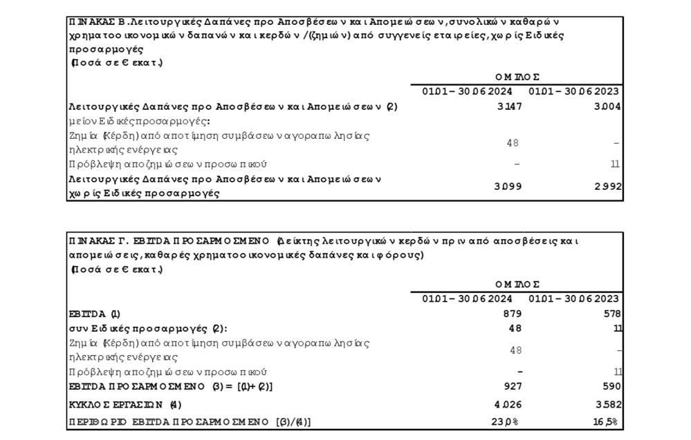 Το EBITDΑ Προσαρμοσμένο εξυπηρετεί στην καλύτερη ανάλυση των λειτουργικών αποτελεσμάτων του Ομίλου και της Μητρικής Εταιρείας, εξαιρουμένης της επίδρασης των Ειδικών προσαρμογών. Για την εξάμηνη περίοδο που έληξε την 30η Ιουνίου 2023 η Ειδική προσαρμογή που επηρέασε το EBITDA Προσαρμοσμένο είναι η πρόβλεψη αποζημιώσεων προσωπικού ύψους € 11,4 εκατ. (αρνητική επίπτωση) για τον Όμιλο και € 2,2 εκατ. (αρνητική επίπτωση) για την Μητρική Εταιρεία. Για την εξάμηνη περίοδο που έληξε την 30η Ιουνίου 2024 η Ειδική προσαρμογή που επηρέασε το EBITDA Προσαρμοσμένο είναι η αποτίμηση συμβάσεων αγοραπωλησίας ηλεκτρικής ενέργειας ποσού € 47,9 εκατ. (αρνητική επίπτωση) για τον Όμιλο και € 187,2 εκατ. (αρνητική επίπτωση) για τη Μητρική Εταιρεία. Το περιθώριο EBITDA Προσαρμοσμένο (%) υπολογίζεται διαιρώντας το EBITDA Προσαρμοσμένο με το σύνολο του κύκλου εργασιών Προσαρμοσμένου. Ο υπολογισμός του EBITDA Προσαρμοσμένου και του περιθωρίου EBITDA Προσαρμοσμένο παρουσιάζεται στον Πίνακα Γ.