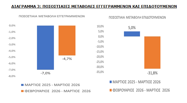 Στον πίνακα 2 παρουσιάζονται οι μεταβολές των εγγεγραμμένων και των επιδοτούμενων από τον αντίστοιχο μήνα του προηγούμενου έτους Μάρτιο 2025 καθώς και από τον προηγούμενο μήνα Φεβρουάριο 2026.