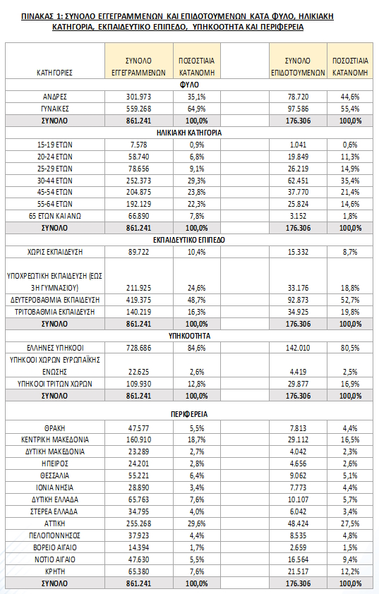 Μεταξύ των Περιφερειών της Χώρας η Περιφέρεια Αττικής και η Περιφέρεια Κεντρικής Μακεδονίας καταγράφουν τον μεγαλύτερο αριθμό εγγεγραμμένων ο οποίος ανέρχεται σε 255.268 άτομα (ποσοστό 29,6%) και 160.910 άτομα (ποσοστό 18,7%) αντίστοιχα.