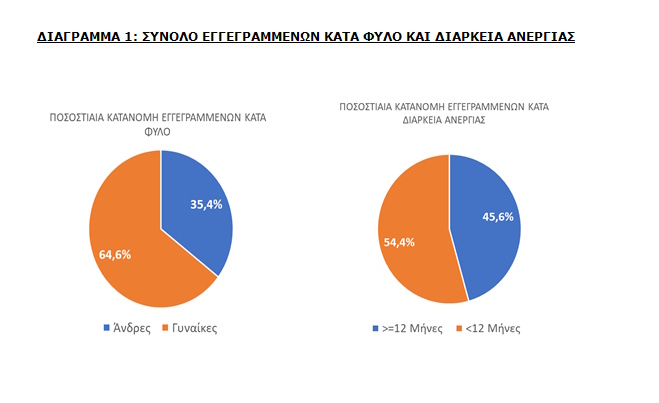 Από αυτούς τους άνεργους οι 412.601 (ποσοστό 45,6%) άτομα είναι εγγεγραμμένοι στο μητρώο της ΔΥΠΑ για χρονικό διάστημα ίσο ή και περισσότερο των 12 μηνών και 491.327 (ποσοστό 54,4%) είναι εγγεγραμμένοι στο μητρώο της ΔΥΠΑ για χρονικό διάστημα μικρότερο των 12 μηνών.